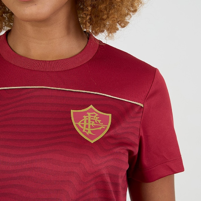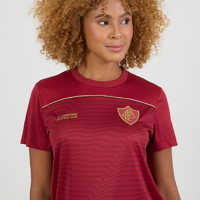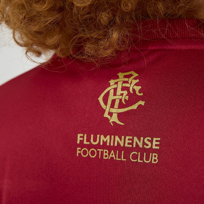 A peça apresenta um visual marcante em tom vinho, com um discreto padrão de listras horizontais que adiciona textura e sofisticação. No lado esquerdo do peito, está estampado o escudo dourado da marca, em formato de escudo estilizado, transmitindo exclusividade e personalidade. Do lado direito, o nome "Fluminense Football Club" também aparece em dourado, reforçando o design premium da camisa.