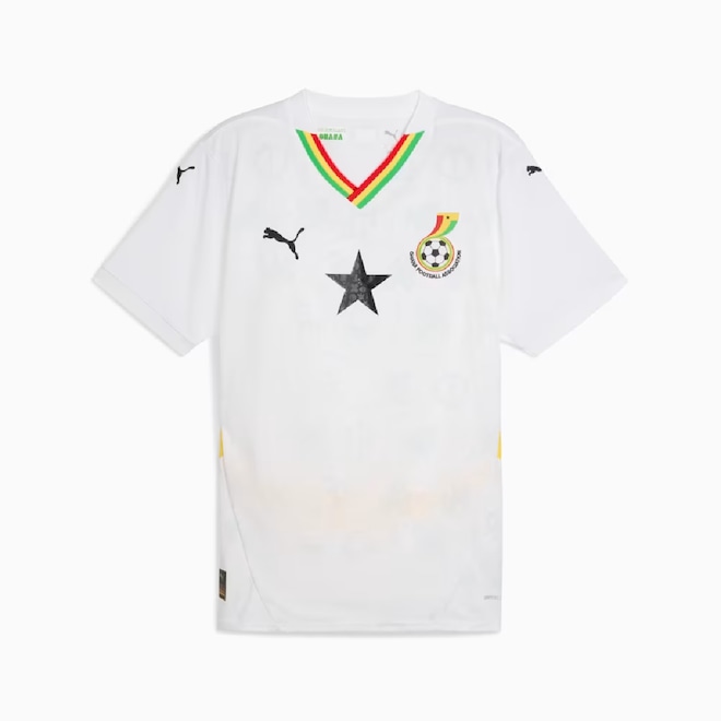 Represente as Estrelas Negras com orgulho no uniforme de Gana. Os símbolos tradicionais Adinkra formam um padrão único por todo uniforme, celebrando a riqueza da herança cultural de Gana. A Estrela Negra no centro completa o estilo.