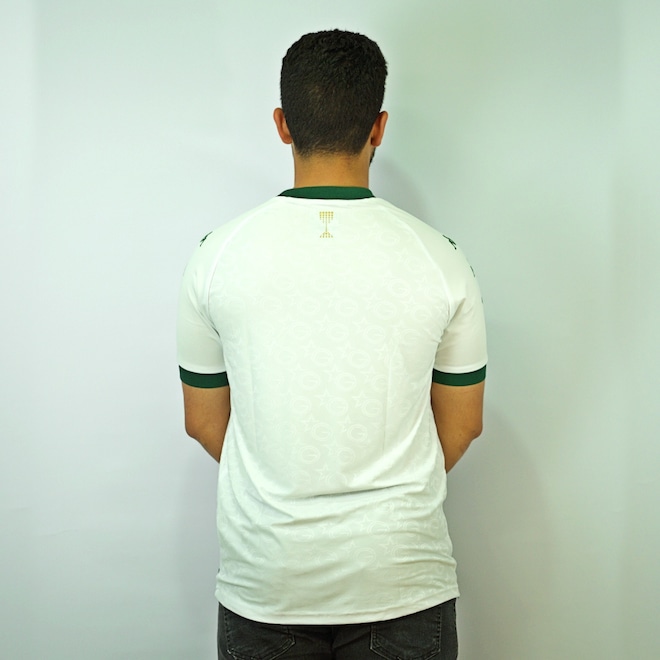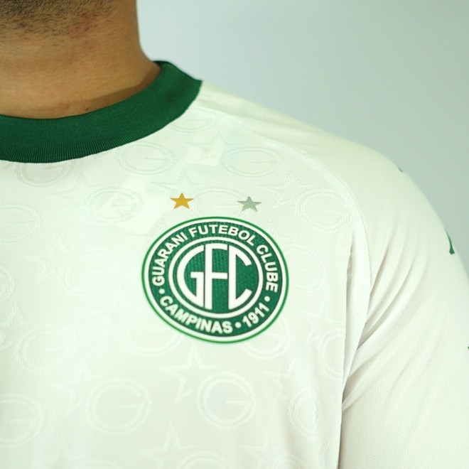 O tecido em jacquard exibe uma padronagem exclusiva com múltiplos "Gs", referência direta ao escudo utilizado na época — um detalhe que transforma o uniforme em símbolo de tradição e orgulho campineiro.