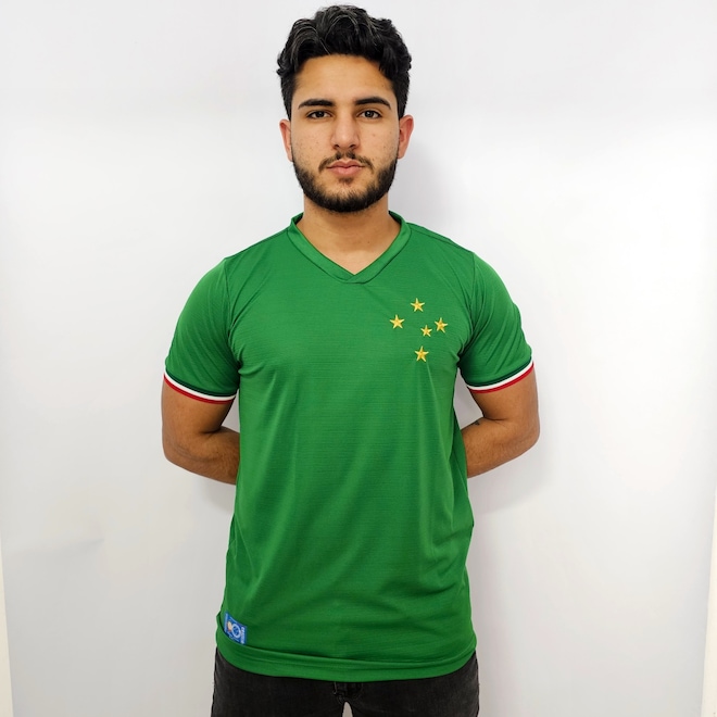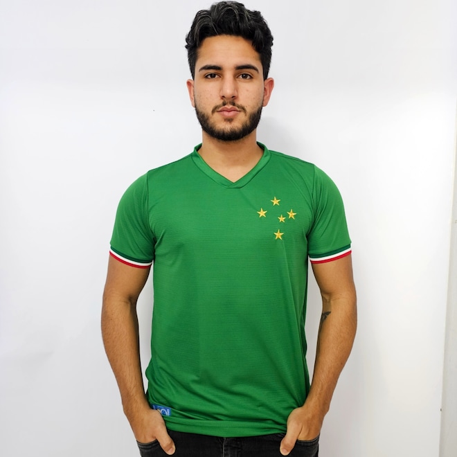 Produzida em 100% poliéster leve e respirável, a peça é verde com as estrelas do Cruzeiro em bordadas do lado esquerdo, detalhes em branco e vermelho no punho das mangas remetendo às cores da Itália.