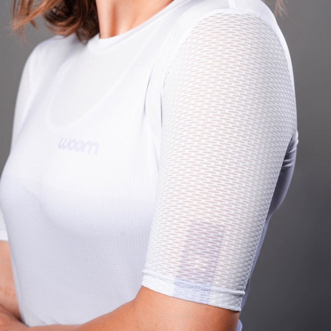 A Camisa de Ciclismo sem zíper Supreme da Woom utiliza o tecido Premium Lite na frente e nas costas. Este tecido tem um toque sedoso e um excelente controle de temperatura e umidade, devido ao seu eficiente sistema de microfuros.