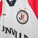 A gola e os punhos das mangas são finalizados com detalhes em preto, criando um contraste elegante. No lado esquerdo do peito está o escudo do clube, que traz a inscrição “JOINVILLE E.C. SANTA CATARINA”, acompanhado por duas estrelas douradas acima do emblema. Do lado direito do peito, encontra-se o logotipo da fornecedora esportiva “VOLT”. O nome “JOINVILLE” aparece em destaque no centro da camisa, em letras pretas e em negrito.