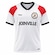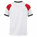 A camisa do Joinville Esporte Clube apresenta um design predominantemente branco, com painéis vermelhos nos ombros que adicionam um toque vibrante.