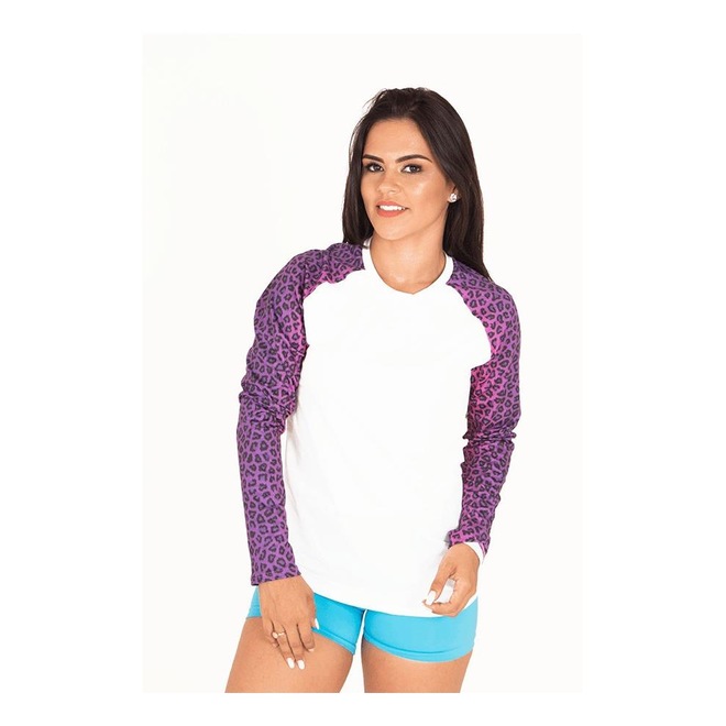 A Camisa Manga Longa Raglan Animal Print UV Fem é confeccionada em dry fit poliéster, que oferece a tecnologia UV50+, bloqueando até 98% da entrada dos raios solares UVA e UVB.