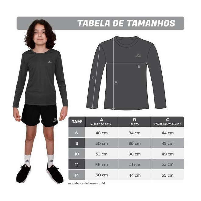 É durável, fácil de lavar, seca com facilidade amassando pouco, e está disponível nos tamanhos 6, 8, 10, 12 e 14 A Camisa Dry Basic LS FPS 50 da Muvin é ideal para a prática de atividades esportivas diversas, como corrida, caminhada, ginástica, treino funcional, práticas de pilates e yoga, bem como também em atividades fitness e na academia.