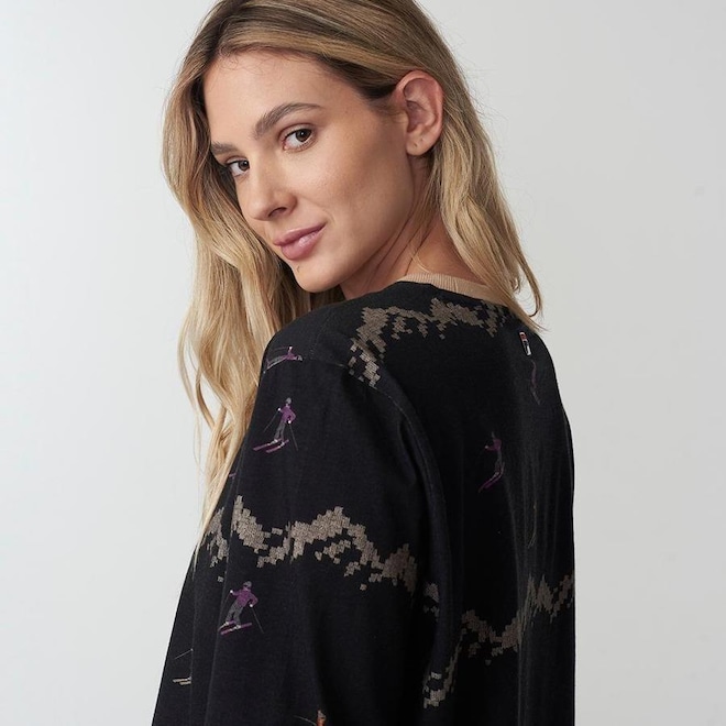Possui gola e punhos em ribana. Tecido produzido em algodão sustentável com selo BCI (Better Cotton Initiative).