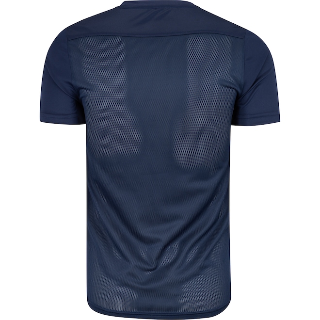 Já sua gola é careca com tira interna, suas mangas são curtas e modelagem Slim Fit.