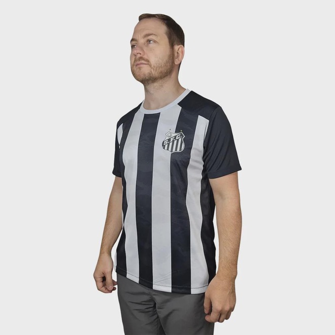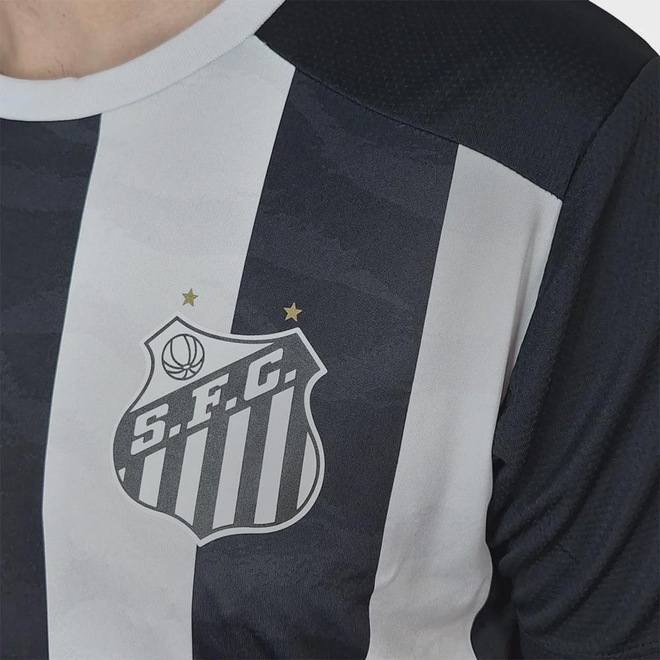 A sigla do Santos estampada com destaque no peito reforça a lealdade e devoção de quem veste o manto com alma e coração.