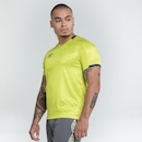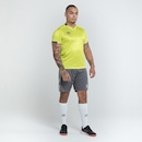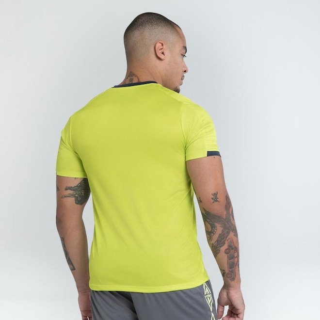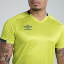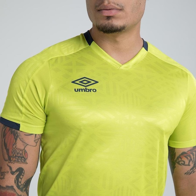Camisa masculina confeccionada em Jacquard de poliéster na parte frontal e nas mangas com parte traseira e parte interna da manga em Mesh respirável. Modelagem regular com manga curta raglan. Possui gola V em ribana com recorte contrastante, grafismos em Jacquard, barra da manga com detalhe contrastante e logo Umbro em termo aplicado na parte frontal direita superior.