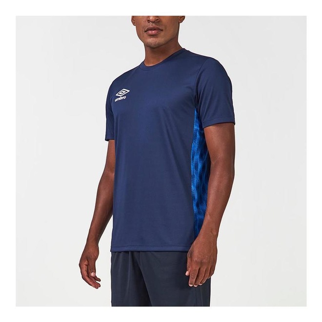 Camisa masculina confeccionada em 100% poliéster. Modelagem regular com gola careca em ribana e manga curta. Os recortes nas mangas e laterais em tecido Mesh, com estampa Diamond Wave sublimada, proporcionam maior respirabilidade durante o uso. Possui logo Umbro em termotransfer aplicado na parte frontal superior direita.