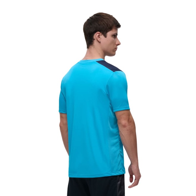- Gola careca com acabamento canelado e faixa interna para controle da transpiração