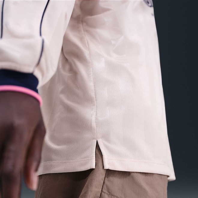 - Ombros caídos e espaço extra no corpo proporcionam um ajuste solto.