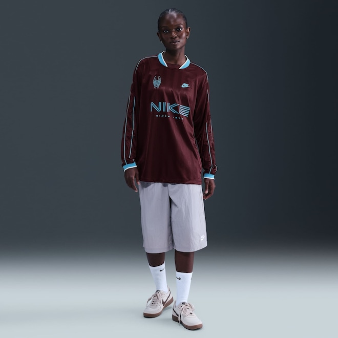 - Ombros caídos e espaço extra no corpo proporcionam um ajuste solto.