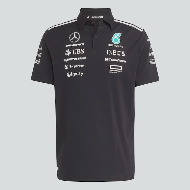 - Sobre o produto - Esta camisa polo da adidas Motorsports é igual à usada pelos engenheiros da equipe de Fórmula 1 da Mercedes - AMG Petronas. A estrutura em poliéster e algodão tem elasticidade adicional para movimentos confortáveis, e as fendas na lateral adicionam cobertura extra. A marca da equipe Mercedes de Fórmula 1 e os logos dos patrocinadores no peito conferem um toque autêntico. Este produto é feito com pelo menos 70% de materiais reciclados. Ao escolher o reciclado, podemos reutilizar materiais já criados, o que ajuda a reduzir o desperdício e a nossa dependência de recursos finitos, além de reduzir a pegada dos produtos que fabricamos. - ref: M16JJA