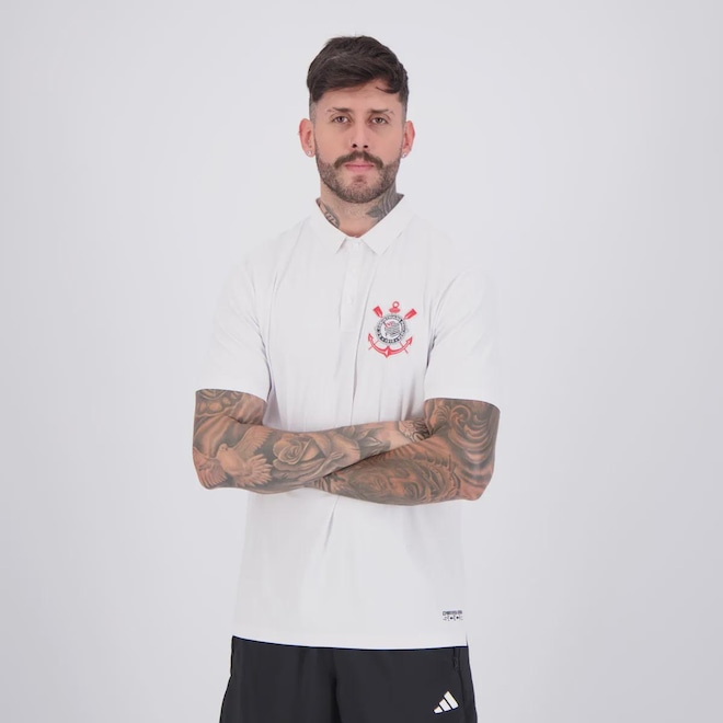 Composição: 85% Poliamida e 15% ElastanoCor Predominante: BrancaIndicado para: CasualGênero: MasculinoOrigem: NacionalTime: CorinthiansEscudo: BordadoManga: CurtaGola: Polo, com abotoamentoDimensões aproximadas (A x L):P: 73 x 50 cmM: 74 x 53 cmG: 75 x 54 cmGG: 76 x 58 cmEG: 77 x 59 cm