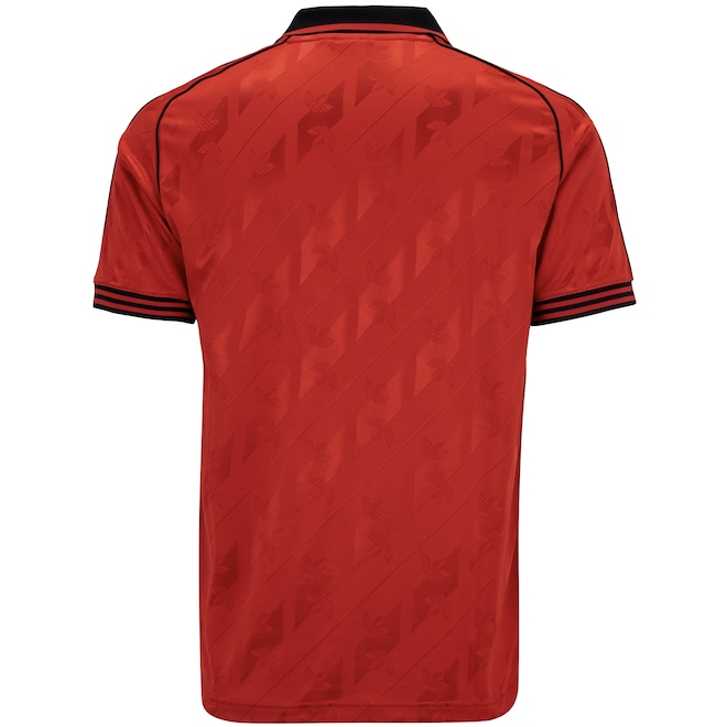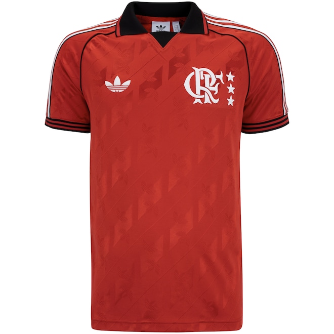 O escudo vintage do CR Flamengo na altura do peito, combinado com o Trefoil da adidas, mantém viva a essência nostálgica do time.