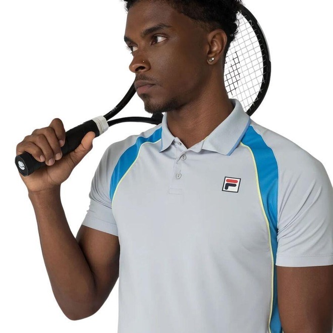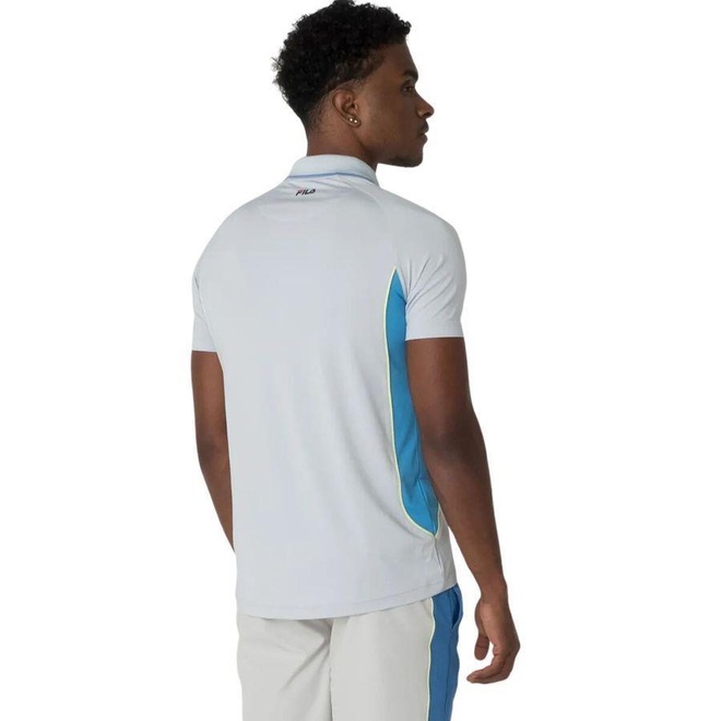 Polo masculina confeccionada em malha de poliéster com elastano e recortes em malha sustentável de poliéster reciclado. Modelagem regular com manga curta raglan e gola polo bicolor em retilínea. Produto ecológico com certificado Oeko-Tex, que testifica o não uso de químicos nocivos na sua fabricação. Seu tecido contém as tecnologias FLOW, que oferece secagem rápida e mantém o corpo na temperatura ideal para a prática esportiva, e a UV PROTECTION, que fornece proteção solar FPS 50+ dos raios UVA e UVB. Possui peitilho com 3 botões esmaltados, cobre gola contrastante, recortes laterais contrastantes com vivo nas costuras, patch F-Box em termo aplicado na parte frontal esquerda superior e logo Fila Letter bicolor em termo centralizado na meia lua abaixo da gola traseira.