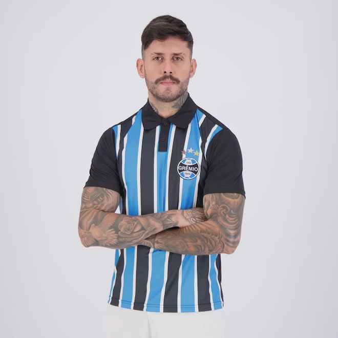 Composição: 100% PoliésterCor predominante: AzulIndicado para: CasualGênero: MasculinoEscudo: BordadoOrigem: NacionalClube: GrêmioManga: CurtaGola: PoloDimensões aproximadas (A x L):P: 72 x 51 cmM: 74 x 53 cmG: 76 x 55 cmGG: 78 x 57 cmEG: 80 x 59 cm