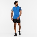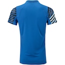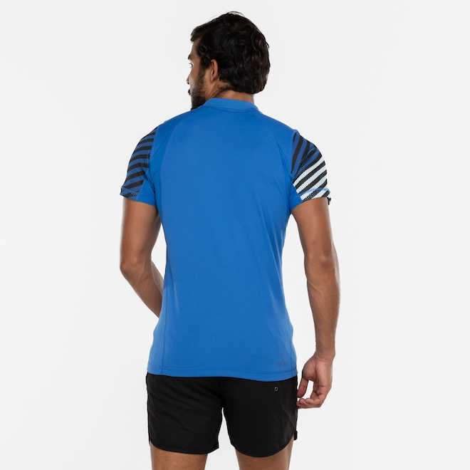 Conta com mangas curtas e tem tecido em poliéster e elastano.