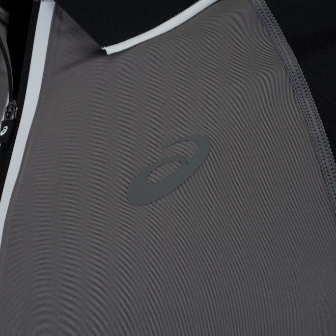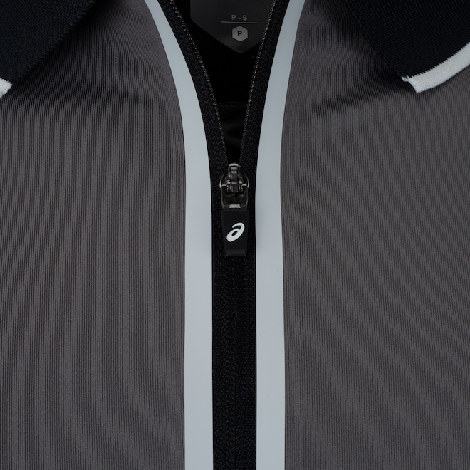 Na parte interna da gola polo, a tira em tecido ajuda a diminuir o desconforto do atrito da costura com zíper selado.