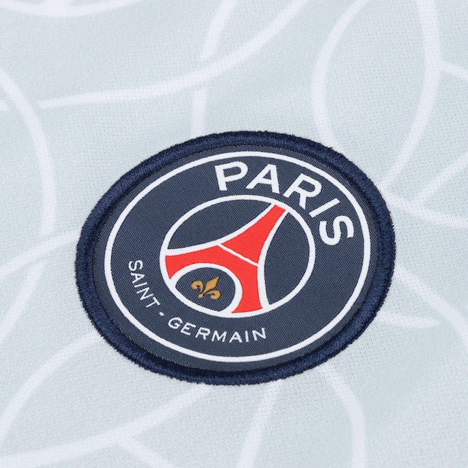 A camisa PSG masculina é de mangas curtas, com gola careca e estampa personalizada.
