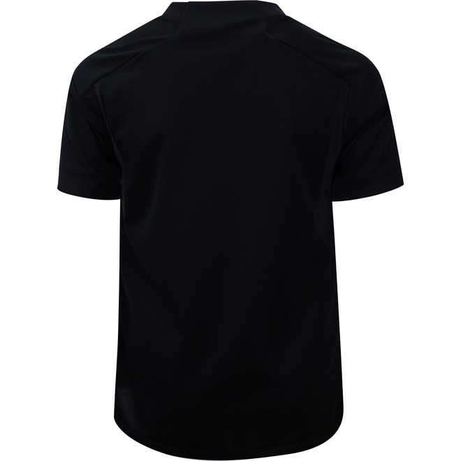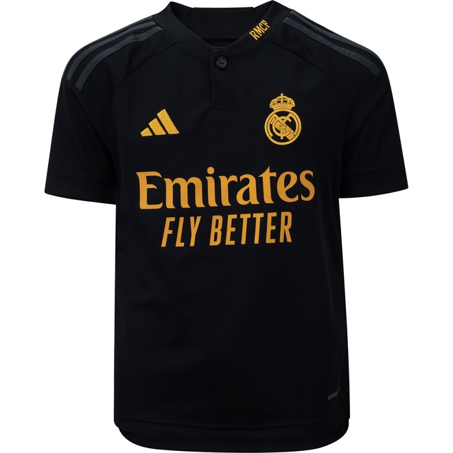 A camisa Infantil do Real Madrid tem mangas curtas e sua gola é careca com ajuste frontal por botão.