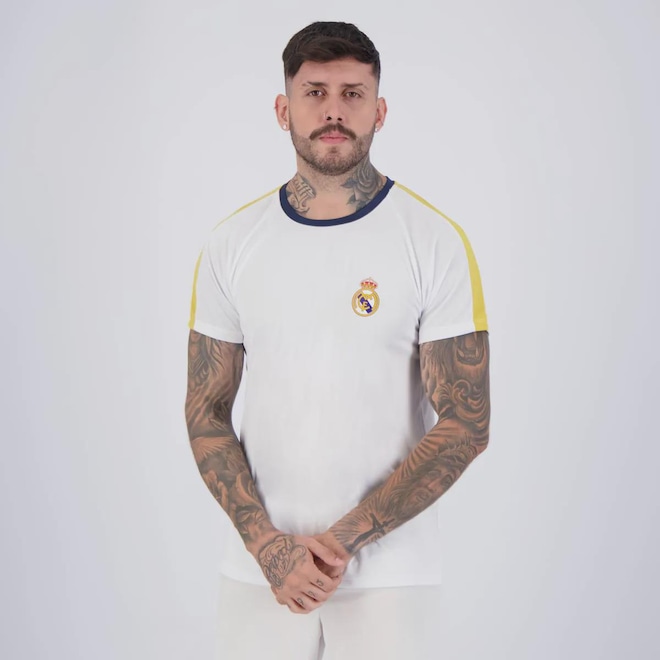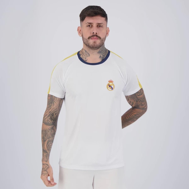 Composição: 100% PoliésterCor Predominante: BrancoIndicado para: CasualEscudo: EstampadoGênero: MasculinoClube: Real MadridOrigem: NacionalManga: CurtaGola: CarecaDimensões aproximadas (A x L):P: 71 x 48 cmM: 73 x 52 cmG: 75 x 55 cmGG: 77 x 58 cm