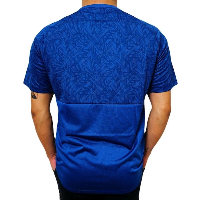 Produzida em 100% poliéster leve e respirável, a peça conta com um design ousado e moderno, na cor azul, com grafismo por toda a camisa, além do escudo do clube estampado do lado esquerdo do peito.