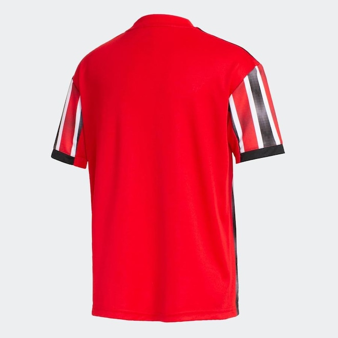 Esta camisa de futebol infantil exibe uma moderna versão digitalizada das listras verticais em vermelho, branco e preto que aparecem tradicionalmente no segundo uniforme do São Paulo FC.