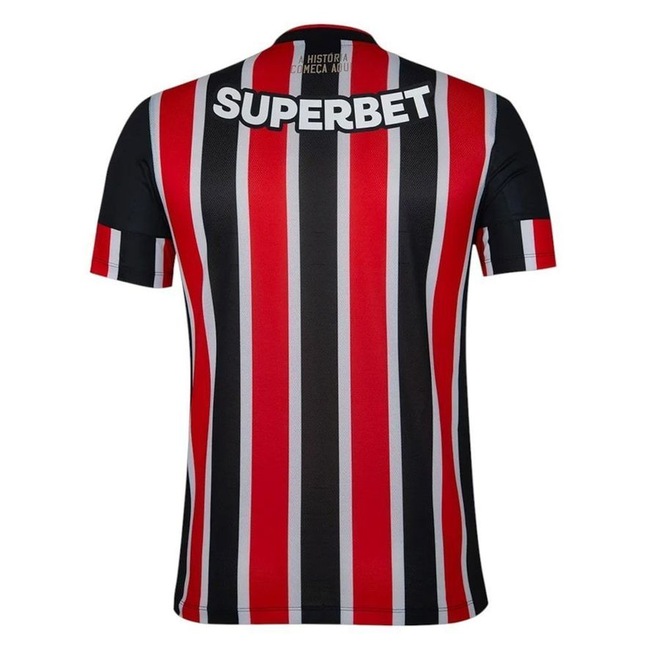 Com o tema "A história começa aqui", a Camisa do São Paulo 2024/2025 AWAY Jogador combina tradição e estilo. O modelo apresenta as clássicas listras verticais e gola V, reforçando a identidade do Tricolor. Traz o tema da coleção e o selo "Made in Cotia: atletas e cidadãos", uma homenagem aos jovens talentos da base do clube.