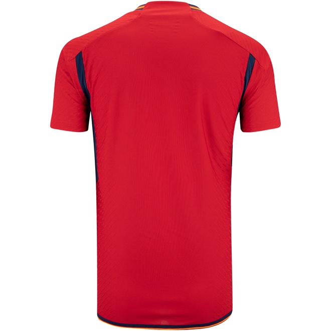 A camisa Seleção da Espanha masculina é de mangas curtas, com gola em “v” e tira interna em tecido que ajuda a diminuir o atrito de contato com a costura.