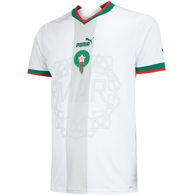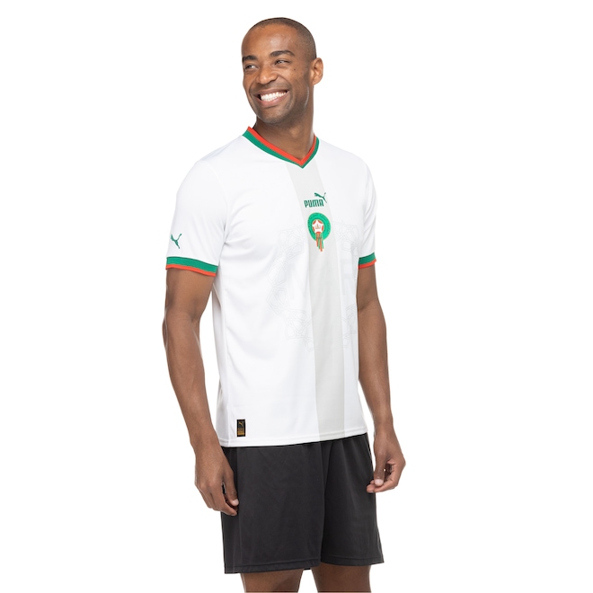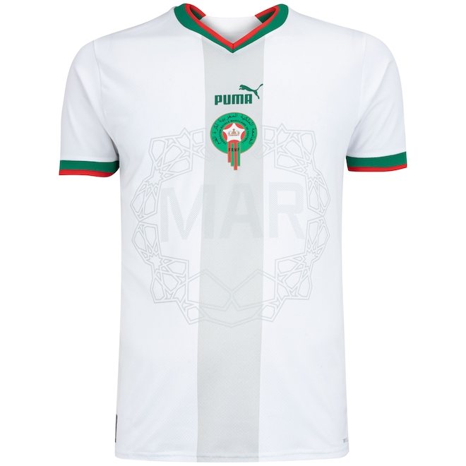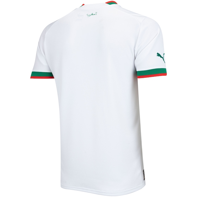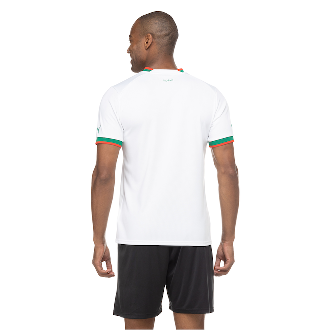No predomínio da cor branco, a Camisa Seleção Marrocos II 22 apresenta detalhes que valorizam o design, detalhes canelados de efeito sanfonadinho, além de etiqueta de autenticidade estampada que confere o padrão PUMA de qualidade.