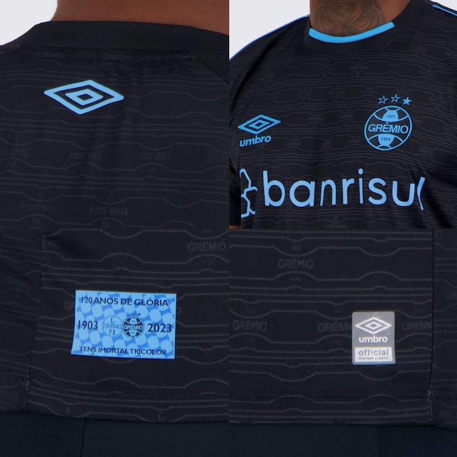 120 anos de Glória, tens Imortal Tricolor! A Umbro apresenta a III camisa do Grêmio para temporada 2023 para comemorar está gloriosa história de noites coperas memoráveis que moldaram o Imortal para ser um dos gigantes do futebol Brasileiro. O manto exibe design na cor preta remetendo a noite, com detalhes em marca d'água, intercalando o nome "Grêmio" em vários formatos, detalhes em azul nas mangas, golas e escudo, além de um selo comemorativo na barra.