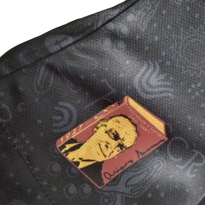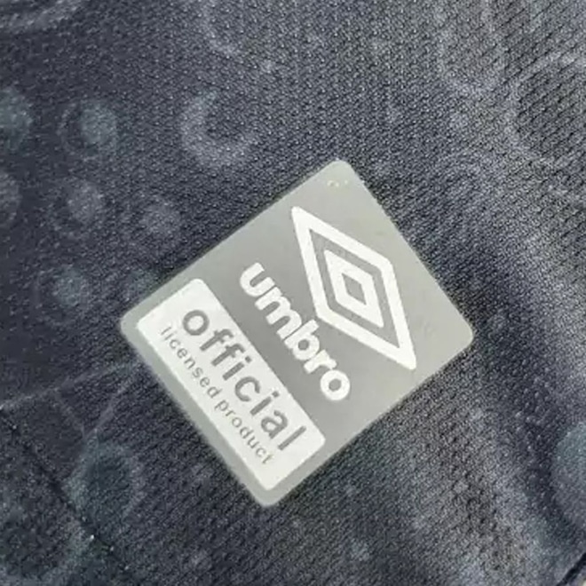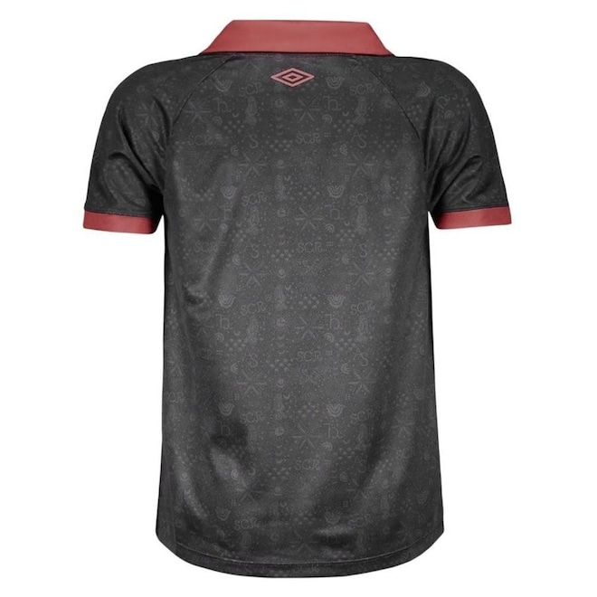 Homenagem ao Sport com identidade cultural: a Camisa III Juvenil do Sport Recife 2023 (Umbro) traz base preta com faixa vertical vermelha inspirada no “Sport Fino” de Ariano Suassuna, além de grafismos texturizados do Movimento Armorial e selo especial com a frase “Felicidade é torcer pelo Sport”.