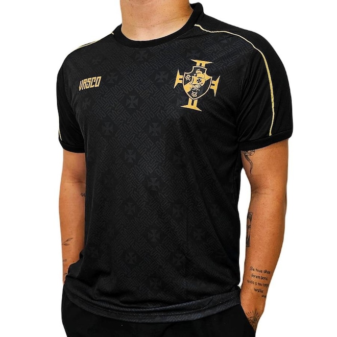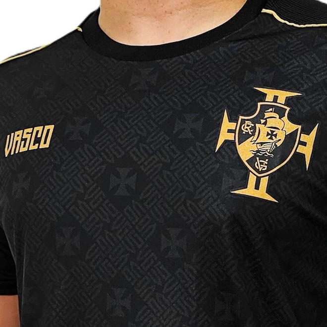Produzida no poliéster leve e respirável, a peça conta com um design ousado e moderno, sua cor é predomintante , com detalhes em dourado, com o escudo do Vasco estampado no peito.