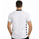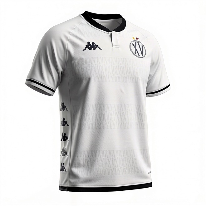 A camisa do uniforme 2 do XV de Piracicaba, desenvolvida pela Kappa, apresenta um design clássico e elegante. Predominantemente branca, ela ganha destaque com os detalhes da marca em preto posicionados na lateral da peça, além do acabamento em preto na gola e nas mangas, criando contraste marcante.