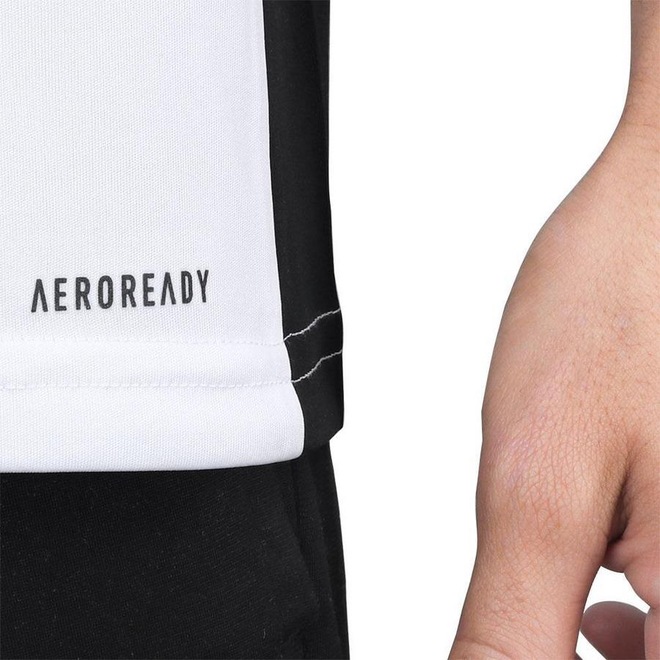 Conheça a Camiseta Adidas Entrada 18 Branca e Preta - Perfil: Training - Material: 100% Poliéster - Detalhamento: Camiseta gola careca, mangas curtas, três listras que fazem referência à marca aplicada acima do ombro, logo e escrita Adidas estampado na parte da frente na altura do peito do lado direito, faixa preta nas laterais da axila até a barra, escrita Aeroready na parte da frente próximo da barra, caimento tradicional - Origem: Nacional.