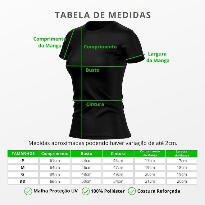 P - Comprimento 61cm Busto 44cm Cintura 45cm Comprimento da Manga 17cm Largura da Manga 17cm.