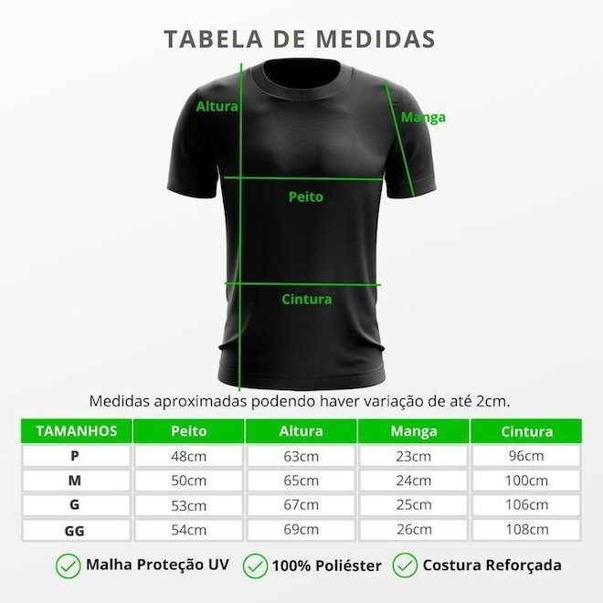 Composição: 100% Poliéster, Malha Dry Fit.