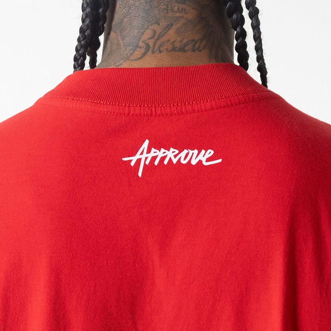 No design, as estampas são aplicadas com técnicas de silkscreen tradicional e silkscreen em gel, proporcionando textura e profundidade visual. A peça é finalizada com etiqueta lateral e TAG personalizada da Collab APPROVE X NFL II, destacando sua exclusividade e conexão com o universo esportivo.