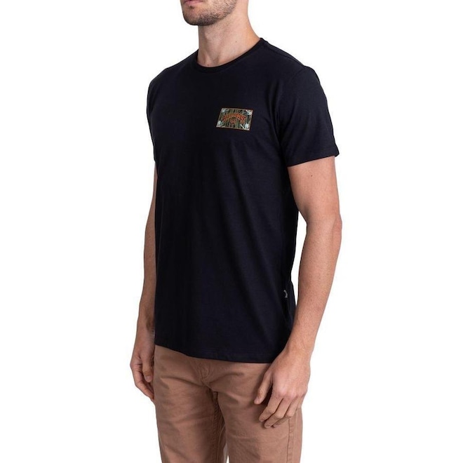 Camiseta de malha penteada de algodão, fio 30/1, manga curta, estampa frontal e traseira, modelagem core fit (regular) e etiquetas personalizadas.