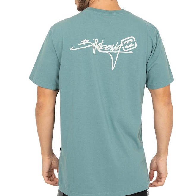 Camiseta Billabong feita em modelagem Core fit, meia malha, estampa aplicada na frente e centro costas e etiqueta da marca aplicada na lateral do lado esquerdo de quem veste.