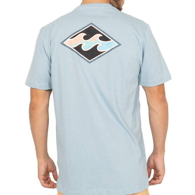 Camiseta Billabong feita em modelagem Corefit, meia malha, estampa aplicada na frente e costas e etiqueta da marca aplicada na lateral lado esquerdo de quem veste.