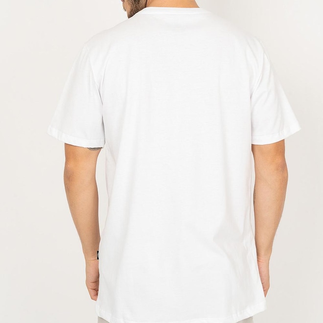 Camiseta Billabong feita em modelagem Corefit, meia malha, estampa aplicada na frente e etiqueta da marca aplicada na lateral lado esquerdo de quem veste.