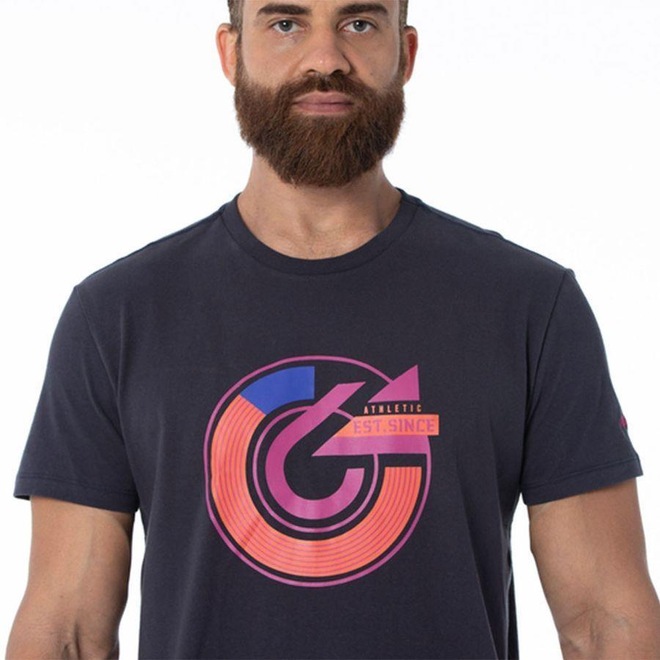 Camiseta em malha mista de algodão e poliéster. Estampa frontal sem toque e logo bordado na manga.