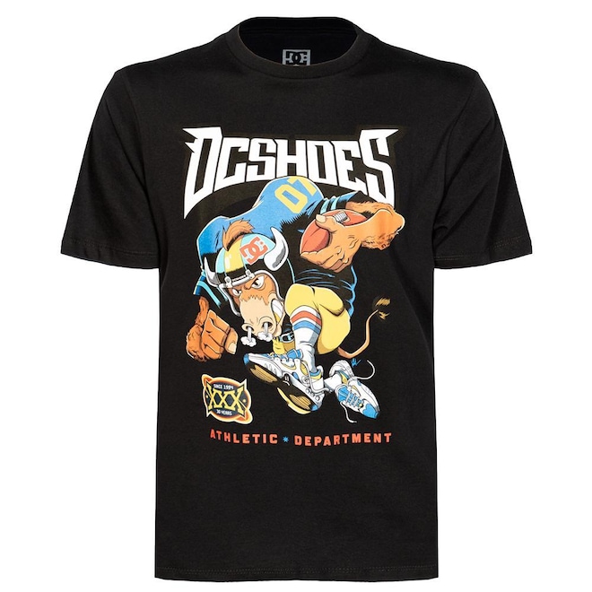Camiseta Dc Shoes feita em modelagem regular, meia malha 30.1, estampa frontal e etiquetas personalizadas.