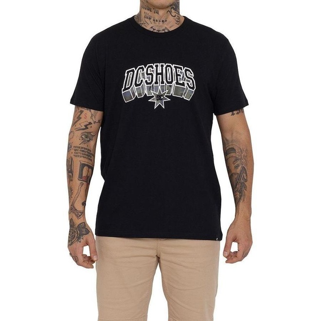 Camiseta DC Shoes com modelagem regular, silk frontal, malha penteada fio 30/1 e etiqueta personalizada da marca.