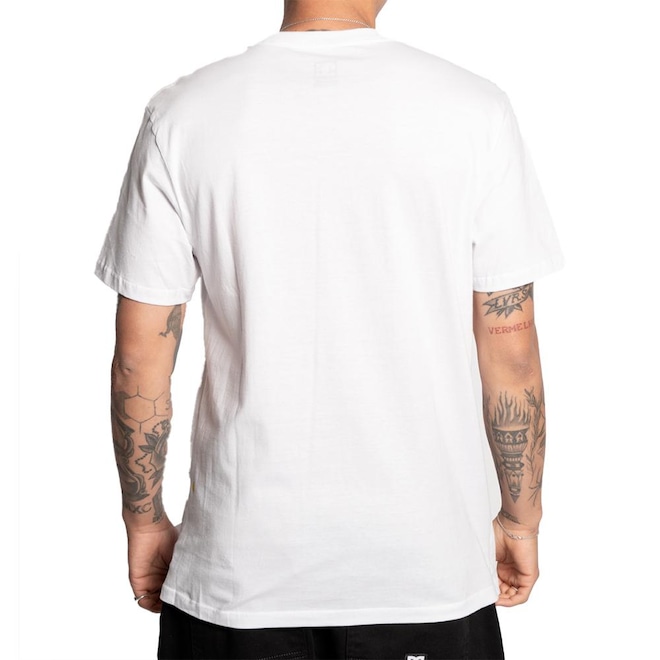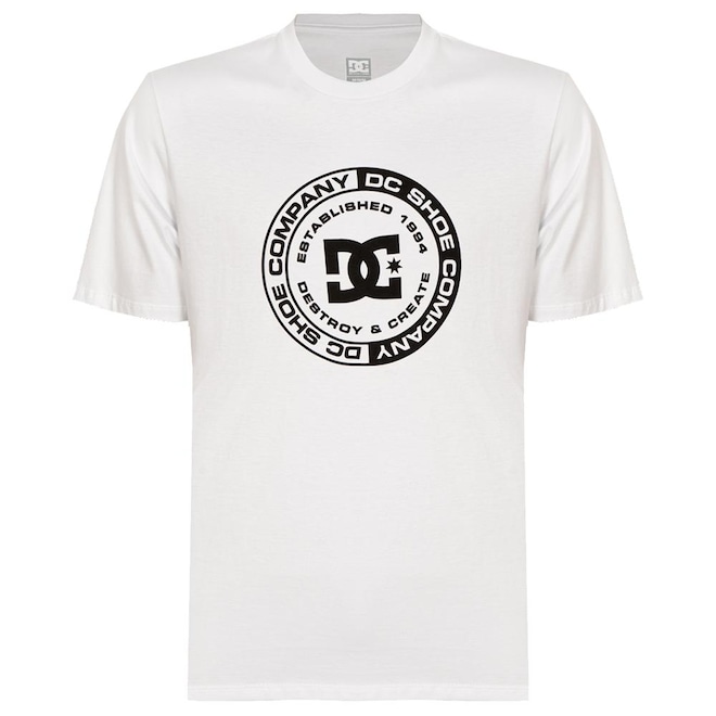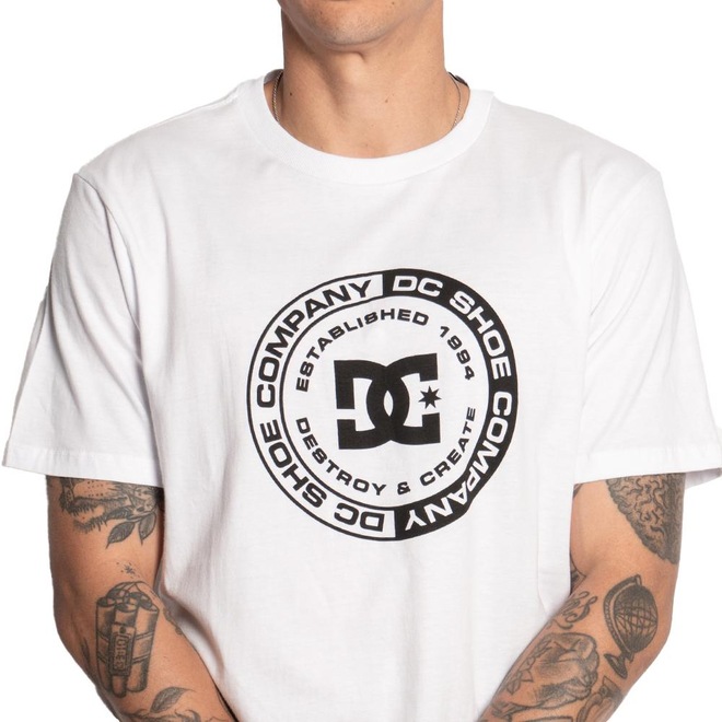 Camiseta Dc Shoes feita em modelagem regular, meia malha 30.1, estampa frontal e etiquetas personalizadas.
