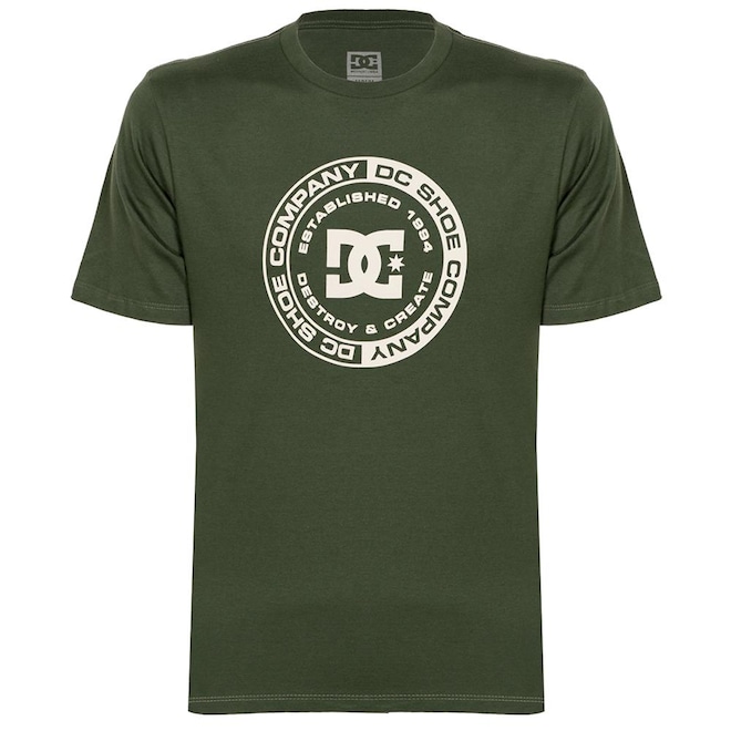 Camiseta Dc Shoes feita em modelagem regular, meia malha 30.1, estampa frontal e etiquetas personalizadas.