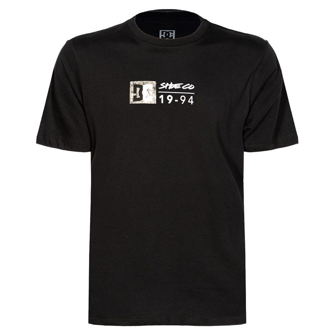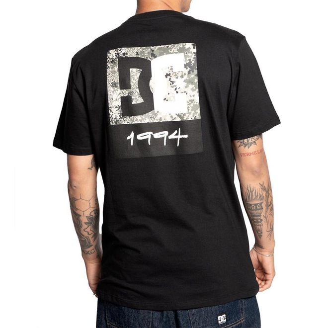 Camiseta Dc Shoes feita em modelagem regular, meia malha 30.1, estampa frente e costas e etiquetas personalizadas.